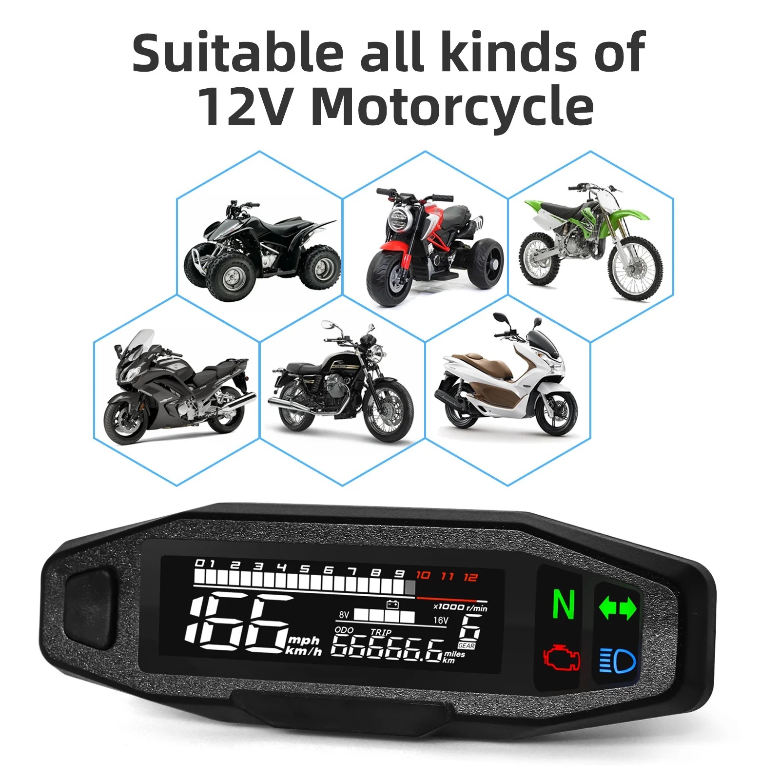 3Geliştirilmiş performans: Bu güçlü dijital elektronik hızölçer, motosikletinizin motor performansının hassas izlenmesini sağlamak için 0-12000 arasında geniş bir RPM aralığı sunar.ve DC12V voltajı istikrarlı çalışmayı destekler.